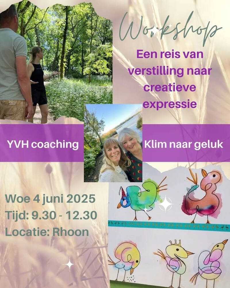 Na deze verdiepende reis in de natuur neemt Yvonne van Hilten van #YVHCoaching je mee in een expressieve reis. Met aquarelverf en sierlijke lijnen laat je jouw gevoel stromen op papier. Zonder moeten, zonder goed of fout – alleen maar zijn. Laat je innerlijke kind de vrije loop in kleur, vorm en fantasie. Een duo workshop met een magische combinatie van zachtheid, verbinding en creativiteit.